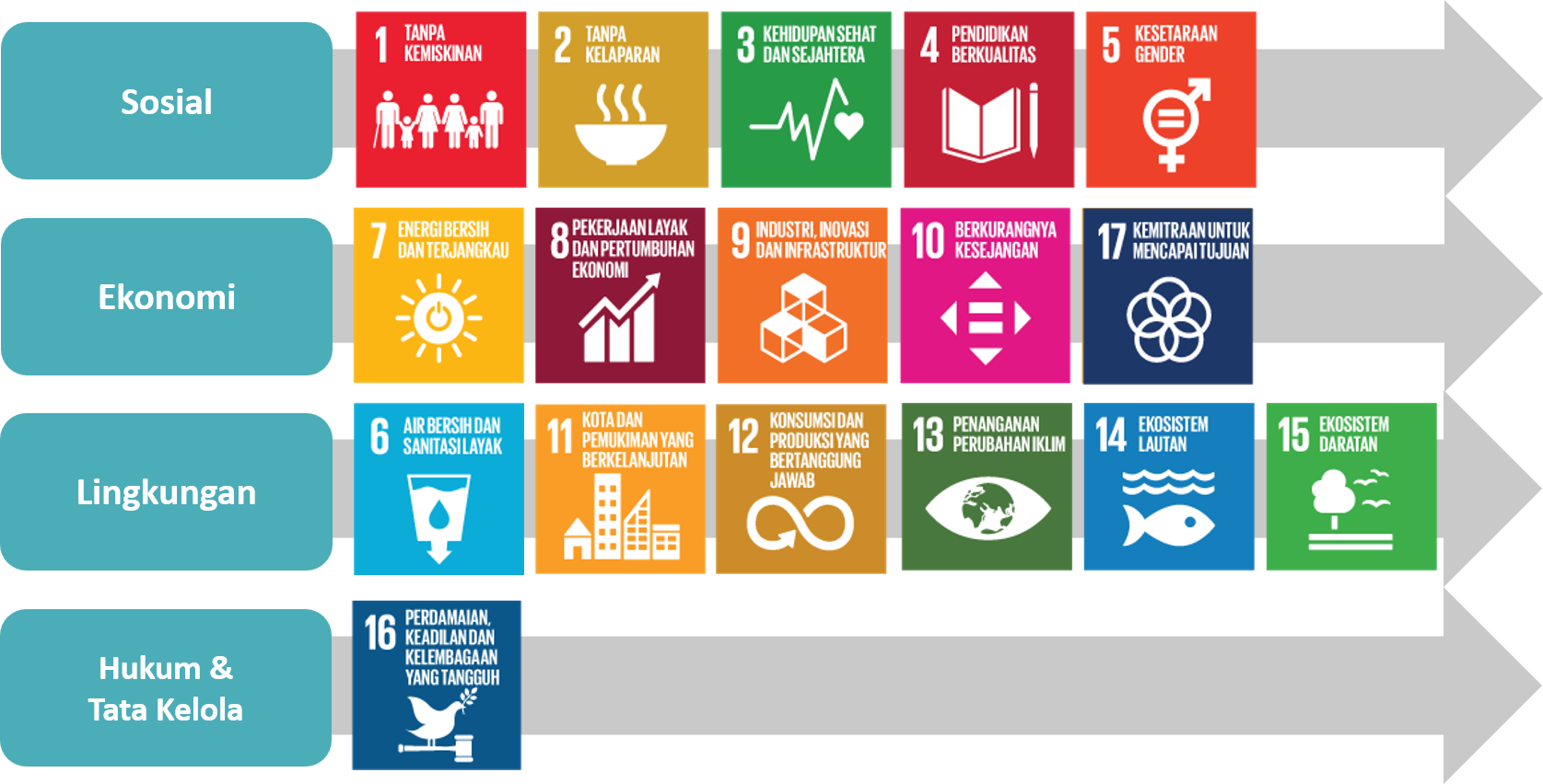 - Pilar Lingkungan meliputi; Air bersih dan sanitasi yang layak, Kota dan pemukiman berkelanjutan, Konsumsi dan produksi yang bertanggung jawab, Penanganan perubahan iklim, Ekosistem lautan, Ekosistem darat;